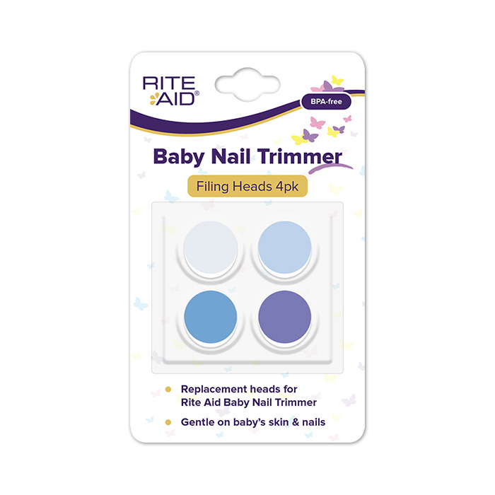 Trymer do paznokci Rite Aid Baby jest dostarczany z 4 wymiennymi głowicami pilnikującymi, z których każda jest przeznaczona dla określonego przedziału wiekowego: 0-3, 3-6, 6-12, 12+ miesięcy.